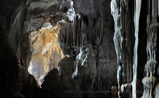 Vang Vieng, c'est le coin des grottes dans les fameuses montagnes karstiques de cette région. Celle que nous avons le plus aimée, c'est la grotte Tham Phu Kham, un magnifique volume avec de belles stalactites, un Bouddha couché à l'intérieur. Elle est plus connue sous le nom de Lagon Bleu, car on peut se baigner à proximité, très agréable après les 200m de montée pour rejoindre l'entrée de la grotte.